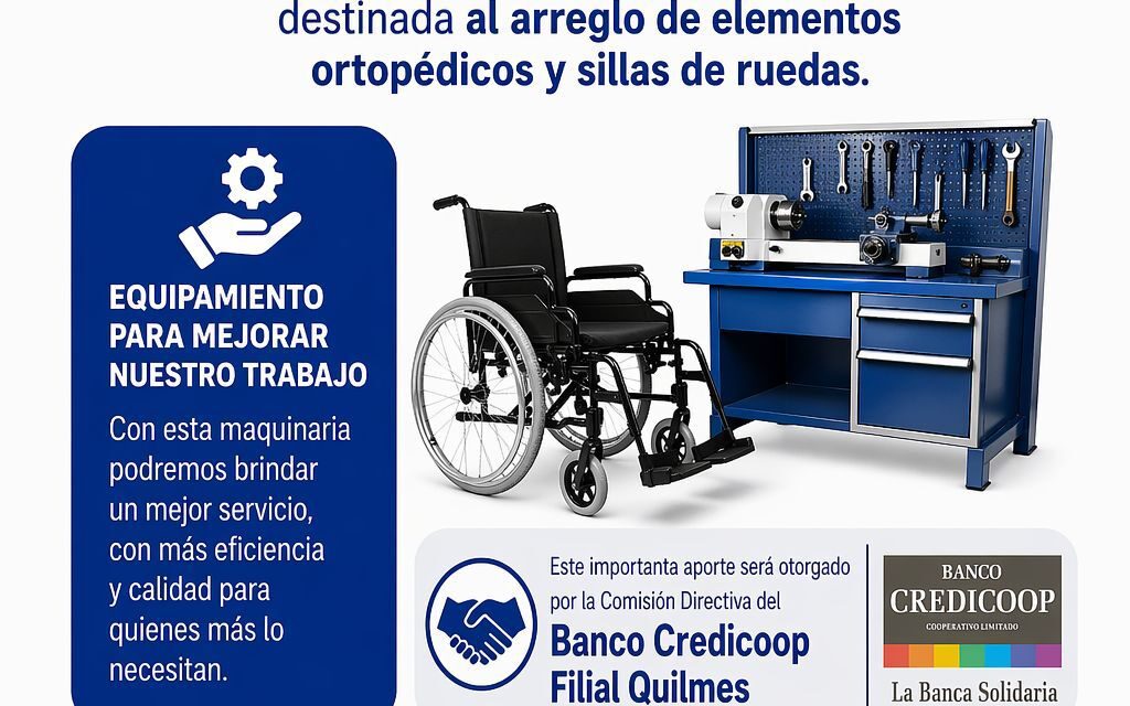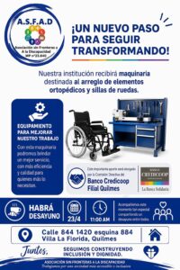 La Asociación sin Fronteras a la Discapacidad (A.S.F.A.D), matrícula provincial N°23.840, anunció la incorporación de nuevo equipamiento destinado al arreglo de sillas de ruedas y elementos ortopédicos. La maquinaria fue donada por la Comisión Directiva del Banco Credicoop Filial Quilmes, en el marco de su programa “La Banca Solidaria”.