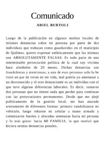 Y señaló que desde hace 20 meses es “víctima” de una “interminable persecución política”, que, según lo afirmado en un comunicado, Burtoli no duda en recordar la banalización de su camioneta, el robo de su celular y las amenazas recibidas a él y su familia.