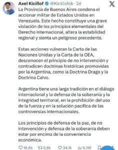 El gobernador Axel Kicillof señaló: “La Provincia de Buenos Aires condena el accionar militar de Estados Unidos en Venezuela. Este hecho constituye una grave violación de los principios elementales del Derecho Internacional, altera la estabilidad regional y sienta un peligroso precedente.