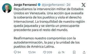 Jorge Ferraresi y reposteò el Twt de Axel Kicillof y afirmó: “Repudiamos la intervención militar de Estados Unidos en Venezuela. Una acción que avasalla la soberanía de los pueblos y viola el derecho internacional. La tranquilidad de nuestra región queda jaqueada y se sienta un preocupante precedente para el resto del mundo.