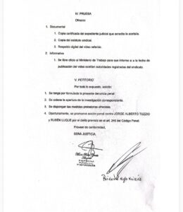 La denuncia se basa en el expediente judicial que acredita la acefalía de UCAIRRA y un video en el que Tuzzio y Luque se presentan como autoridades del sindicato.