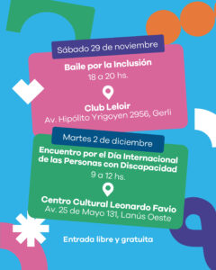 Mientras que el martes 2 de diciembre, de 9 a 12, se desarrollará un encuentro por el Día Internacional de las Personas con Discapacidad en el Centro Cultural Leonardo Favio, situado en la avenida 25 de Mayo N° 131, en Lanús Oeste.