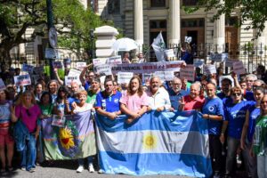 Claudio Arévalo, secretario general de ATE provincia de Buenos Aires, señaló que “le pedimos a la Legislatura que le den las herramientas al gobernador de la provincia para que pueda gestionar para las mayorías populares. El ajuste que estamos recibiendo del gobierno nacional y el robo que nos hizo de 13 billones de pesos, que eran utilizados para salud, educación y políticas públicas. ya no lo tenemos los bonaerenses”.