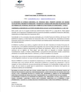 El objetivo "es proteger a los usuarios viales de los abusos que sufrirán con el plan del Gobierno Nacional denominado Red Federal de Concesiones (RFC), que se considera un falso peaje inconstitucional e injusto".