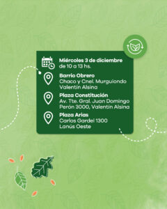 El viernes 5 estará presente en las plazas San Martín (Santiago Plaul N° 1953, Lanús Oeste) y Capitán de Los Andes (avenida Hipólito Yrigoyen N° 3863, Lanús Oeste). Finalmente, el sábado 6 se llevará a cabo en la plaza Auyero (Ramón Cabrero y Córdoba, Remedios de Escalada).