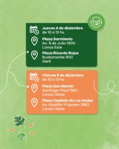 El lunes 1 la jornada se desarrollará en las plazas Mariano Moreno (avenida Hipólito Yrigoyen N° 6200, Remedios de Escalada) y Alajarín (Cnel. Rauch N° 3520, Remedios de Escalada). Mientras que el martes 2 se hará en la plaza Villa Obrera (Eva Perón N° 2400, Lanús Este) y en el Parque Lineal (avenida Gral. Pinto N° 4700, Monte Chingolo).
