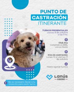 Lanús Gobierno entregará nuevos turnos para la Castración Itinerante de mascotas este jueves 9 de octubre, en el Club Ata (Catamarca 2985, Lanús Oeste), a partir de las 9 horas. Los mismos se repartirán hasta que se agoten los cupos disponibles.