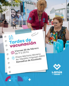 Lanús Gobierno informa que el viernes 20 de febrero, de 17 a 20, se llevará adelante una nueva jornada del programa “Tardes de Vacunación” en la plaza Mariano Moreno, ubicada en la avenida Hipólito Yrigoyen N° 6200, en Remedios de Escalada.