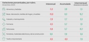 Al desagregar los datos se evidenció una dinámica similar: seis de los siete rubros relevados presentaron retracciones, siendo los descensos más agudos los de Bazar y decoración (-15%) y Perfumerías (-9,8%). En contrapartida, el único sector con un crecimiento interanual fue Ferretería, materiales eléctricos y de la construcción, con una suba del 0,8%.
