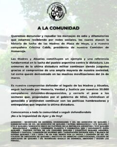 Adhesiones: Secretaría de Mujeres, Diversidades y http://DD.HH del Municipio de Quilmes, SUTEBA, ATE Quilmes, CTA-A, PCR, Movimiento Evita, Colectivo Quilmes Memoria Verdad y Justicia, entre otras organizaciones.