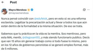 En sus redes sociales, Mayra afirmó: "Nunca pensé coincidir con @edufeiok, pero en esto sí: es una reforma esclavista. Legalizar la precarización actual y llevar a todos los que aún están dentro de la formalidad a la misma situación. De eso se trata."