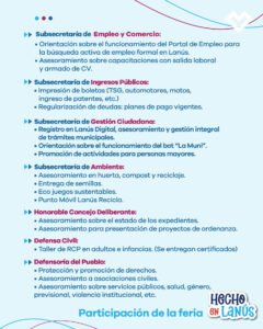 Esta edición también contará con la participación de la clásica Feria “Hecho en Lanús”. Vale resaltar que esta acción forma parte de una decisión política del intendente Julián Álvarez de descentralizar la gestión municipal, con la finalidad de que las y los lanusenses realicen trámites y accedan a distintas propuestas cerca de sus casas.