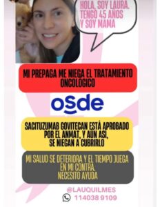 Según explicaron, desde octubre OSDE le niega la provisión de la medicación ante lo cual debió contratar abogados para iniciar una acción de amparo en la que solicita la cobertura integral y total de TRODELVY (SACITUZUMAB GOVITECAN). Laura debe aplicarse 2 1/2 ampollas por semana y cada una puede salir hasta 4 millones de pesos, lo que es imposible costear de manera particular.