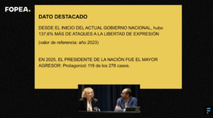 Un apartado tiene que ver con las acciones judiciales. “Durante el 2025 hubo 20 demandas contra periodistas. Una cifra muy superior a lo que se recuerde desde el regreso de la democracia. También se produjeron 9 amenazas de demandas”, expresó Miller, que también es monitora.