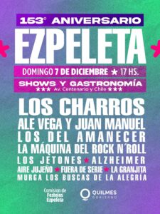 El Municipio de Quilmes convoca a las y los vecinos de todo el distrito a participar de las actividades que se desarrollarán en el marco de los festejos por el 153º aniversario de la localidad de Ezpeleta, a desarrollarse este domingo 7 de diciembre desde las 17, con entrada libre y gratuita, con ferias gastronómicas y de emprendedores, y shows con el cierre estelar de Los Charros.