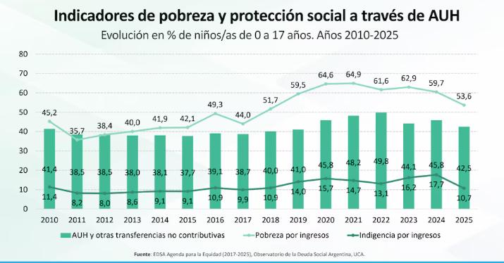 La pobreza en niños y adolescentes llegó al 53,6% en 2025, mientras que la indigencia al 10,7%.