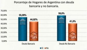 Uno de los cambios más disruptivos respecto a años anteriores es la convergencia entre el crédito formal e informal. Mientras que en 2023 la deuda no bancaria dominaba con una diferencia de 40 puntos porcentuales, en la actualidad el escenario es casi paritario: el 55,1% de los hogares posee deuda bancaria, frente a un 59% que mantiene compromisos no bancarios.