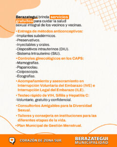 Además, se realiza el Testeo Rápido de VIH, Sífilis y Hepatitis C, de maneravoluntaria, gratuita y confidencial. Por otro lado, funcionan un Plan Municipal deGestión Menstrual; Consultorios Amigables para la Diversidad Sexual; Talleres y