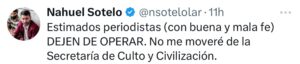 Horas atrás, cansado de los rumores que lo indicaban en la Cancillería. el referente y funcionario nacional Nahuel Sotelo, escribió en redes sociales: " Estimados periodistas (con buena y mala fe) DEJEN DE OPERAR. No me moveré de la Secretaría de Culto y Civilización".