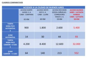 La entidad presentó cuadros comparativos que dejan en evidencia la disparidad tarifaria entre los accesos nacionales y los provinciales gestionados por AUBASA. Mientras que el $/km para un automóvil en hora pico en el Acceso Norte es de $14, en la Autopista Buenos Aires – La Plata la cifra asciende a $93, representando un costo un 560% superior.
