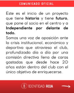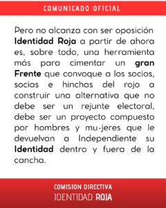 Pero no alcanza con ser oposición. Identidad Roja a partir de ahora es, sobre todo, una herramienta más para cimentar un gran Frente que convoque a los socios, socias e hinchas del rojo a construir una alternativa que no debe un rejunte electoral, debe ser un proyecto compuesto por hombres y mueres que le devuelvan a Independiente su dentidad dentro y fuera de la cancha.