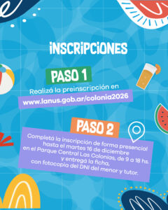 Los interesados y las interesadas en formar parte deberán completar el formulario que está en el enlace www.lanus.gob.ar/colonia2026 y, como segundo paso, tendrán que concurrir presencialmente al Parque hasta el martes 16 de diciembre, de 9 a 18 y presentar la ficha de autorización impresa, con fotocopia del DNI del menor y del tutor, madre o padre.